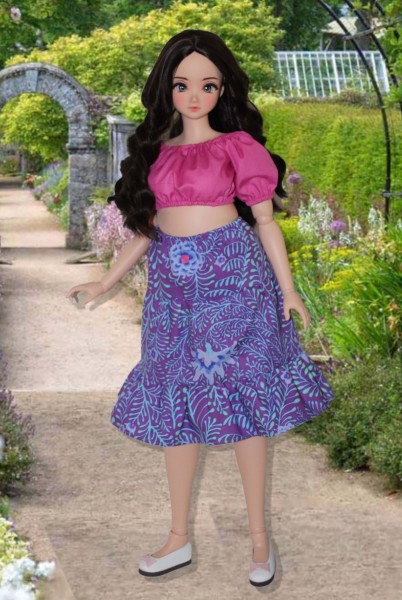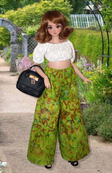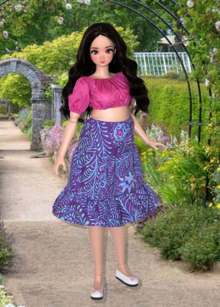 Up for consideration is Joyful Tiers for 60cm Smart Doll Pear body dolls with the standard bust. The pattern features a short-sleeved, cropped peasant top gathered at the neckline and below the bust, a three-tier skirt with an elastic waist, and a pair of three-tier palazzo pants.