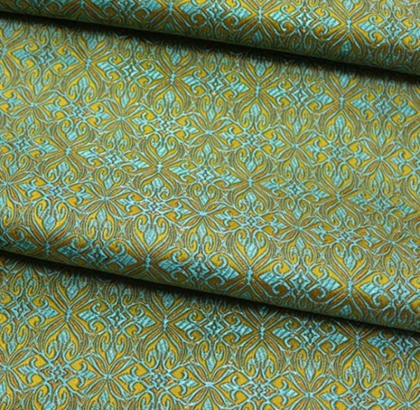 Beautiful teal green and yellow polyester jacquard fabric with a delicate pattern.