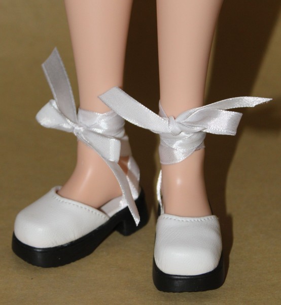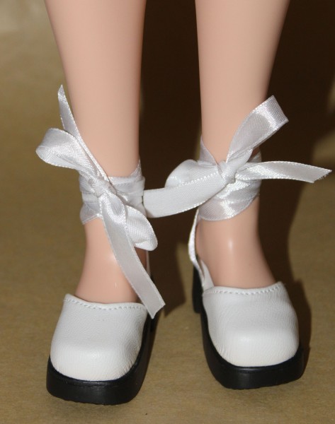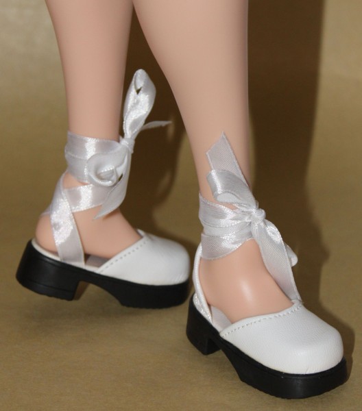 Pretty White Lace-Up Ballet Shoes with a platform heel. These fit Smart Doll & Kaye Wiggs, size 63/25mm. They are a Monique Gold product. |