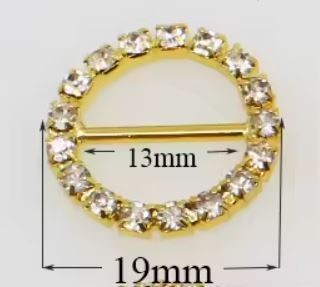 19mm round rhinestone buckle. 1 per pack. Inner dimension is 13mm. Available in gold tone or silver tone.