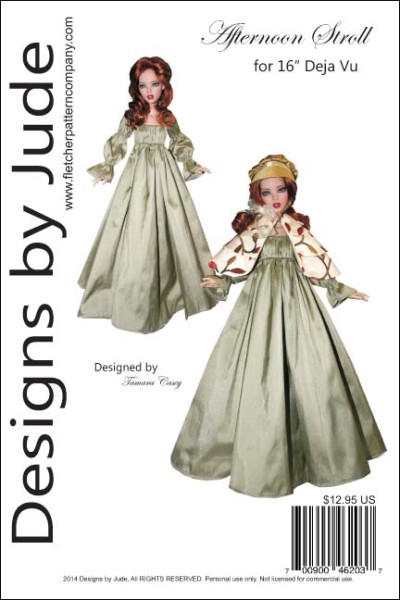 Up for consideration is Afternoon Stroll, a pattern for 16" Deja Vu dolls. The pattern features an gathered empire waisted dress with double gathered long sleeves, three layer cape with collar and a bonnet. The pattern is designed to be used with silks, satins, cotton blends and nylon. Notions needed are 3 snap sets and 1 hook and eye set and ribbon for the bonnet tie. This design is available for Ellowyne, Tyler, American Model and Evangleine. The PDF version prints on A4 and 8 1/2 x 14 legal size paper.