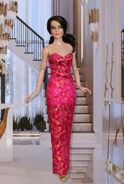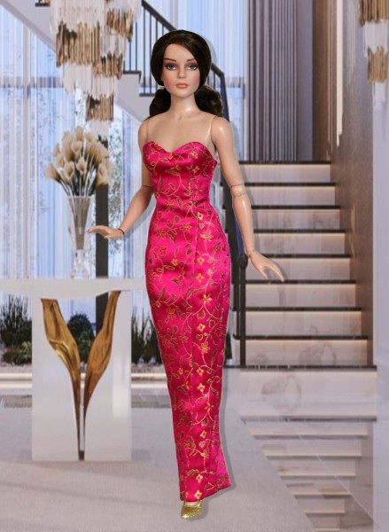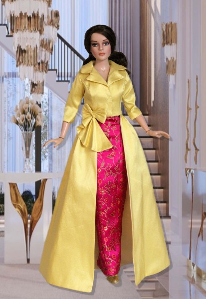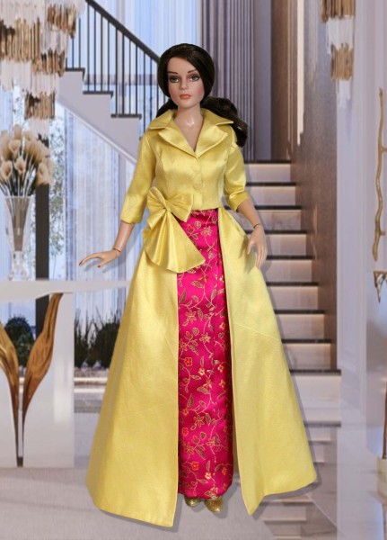 Up for consideration is Dramatic Entrance, an ensemble featuring a fully lined, brocade strapless dress and a yellow-gold silk structured overskirt coat with 3/4-length sleeves, a wide collar, and a sculptural bow accent. The items were made from a pattern by the same name.