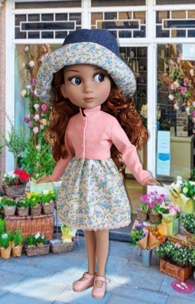 A doll clothes sewing pattern designed to fit 14" Patience, Bucket List. The pattern features a short dress baby doll dress, short-waisted long sleeve jacket and a bucket hat. The dress is partially lined with a snap closure. There is a sewing tutorial for this pattern on our Designs by Jude YouTube channel.