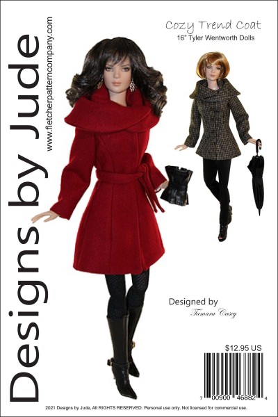 Up for consideration is Cozy Trend Coat, a stylish pattern designed to fit the 16" Tyler Wentworth body dolls. The pattern features a fully lined long sleeve coat with a front snap closure and unique cowl collar that can also be worn as a hood. The pattern includes 2 coat lengths: hip and mid thigh. All of our patterns are available in PDF format and PDF patterns print on A4 and 8 1/2 x14 legal size paper.