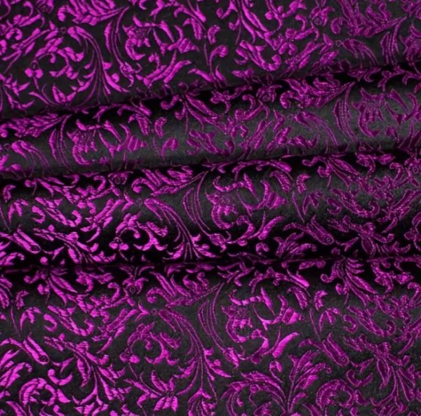 Beautiful fuchsia & black polyester jacquard fabric with a delicate, flowing wave pattern.
