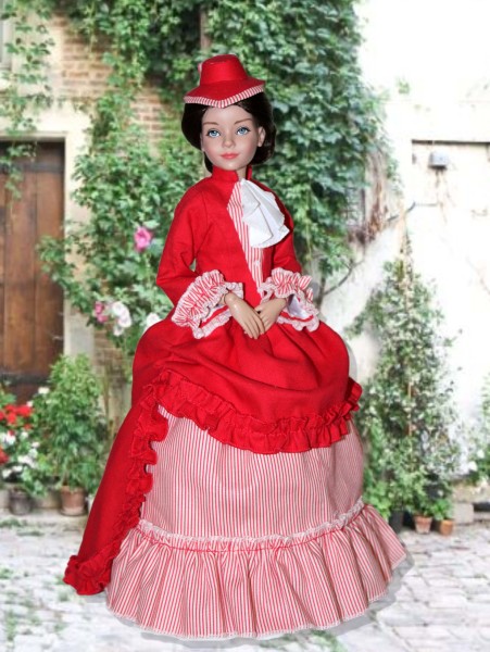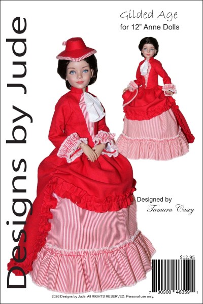 Up for consideration is Gilded Age for 12" Anne dolls. The pattern features a fully lined jacket with a front inset, high collar, and trumpet sleeves. The floor-length skirt has an attached overskirt with a gathered front apron and cascading back train with a delicate ruffled edge. The look is perfected with an optional neck scarf and teardrop hat. There is a sewing tutorial for this pattern on our Designs by Jude YouTube channel.