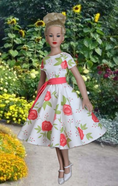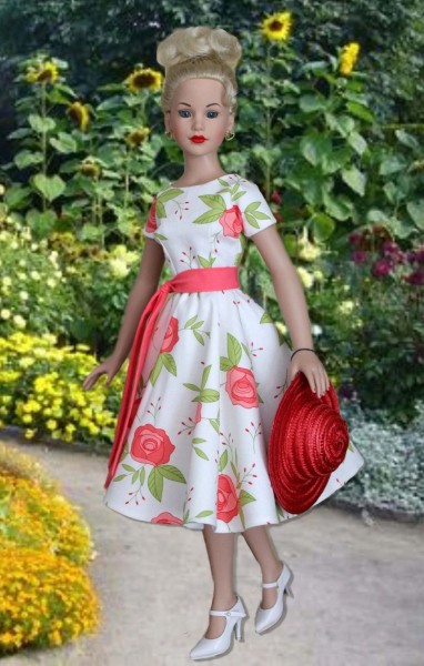Up for consideration is "Going Shopping" for 18" Kitty Collier dolls. The dress features a fitted bodice with short sleeves and a full skirt. The dress is fully lined with a snap back closure. The look is completed with a waist sash.