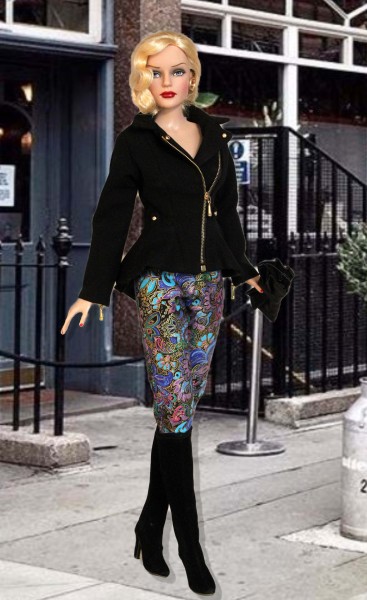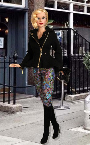 Up for consideration is Moto Style for RTB101 dolls. The ensemble includes a black asymmetrical zippered jacket with attached peplum and stud detail paired with slim-fitting colorful pants. The items were made from a modified version of the Moto Style pattern.