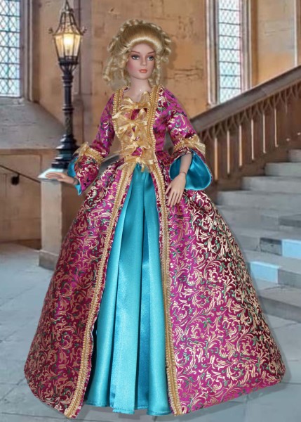 Beautiful purple, gold, and teal polyester jacquard fabric with a delicate, flowing wave pattern.