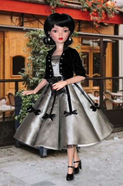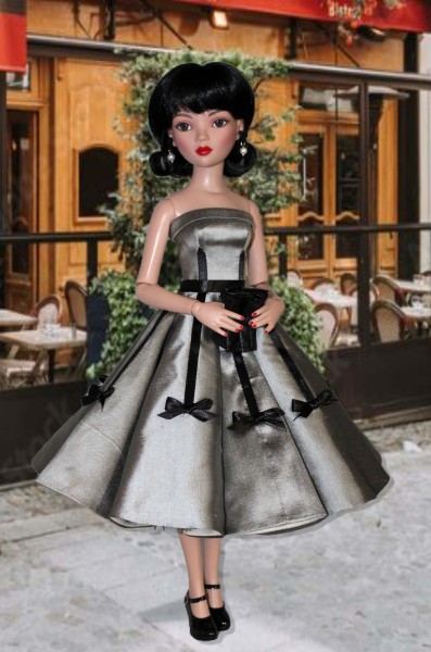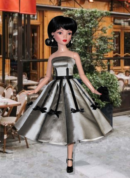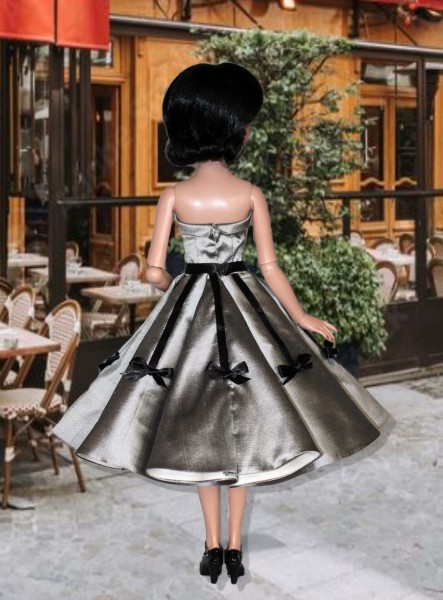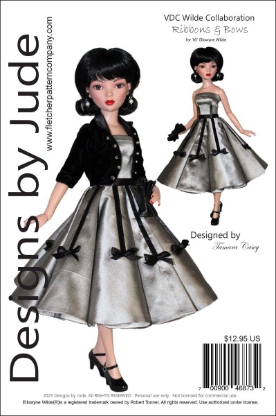 Up for consideration is Ribbons & Bows for Ellowyne Wilde. The pattern features a classic 1950s strapless dress with a double-circle skirt embellished with satin ribbons and bow details. The dress is fully lined with a snap-back closure. The look is completed with a sharp bolero jacket with ¾ length sleeves and a fold-down collar. Also included is a tulle underskirt to support the silhouette. The pattern was created in sponsorship of the Virtual Doll Convention Wilde Subscription Program. A sewing tutorial for the design is available on the Designs by Jude YouTube channel.