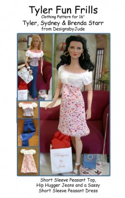 Clothing pattern to fit 16" fashion dolls; Tyler, Sydney, Betty Ann, Brenda Starr, Jac and their friends. The pattern includes a short sleeve peasant top, hip hugger jeans and a short sleeve peasant dress with short sleeves. Pattern has been designed to use with cotton, cotton blends, light weight denim or similar fabric. PDF version prints on A4 and 8 1/2 x 14 legal size paper. This design is also available for Ellowyne and the Teen Body Tonner dolls.