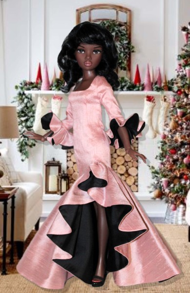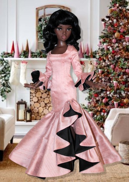Up for consideration is a floor length pink & black silk gown to fit Neema and Ellowyne dolls. The gown is fully lined with a zipper closure. The dress was made from the Spanish Kiss pattern. Please note: Ellowyne's hands must to be removed to wear the gown due to the slender sleeves.