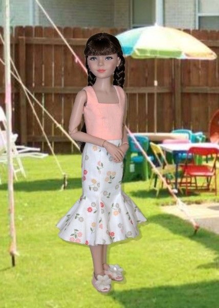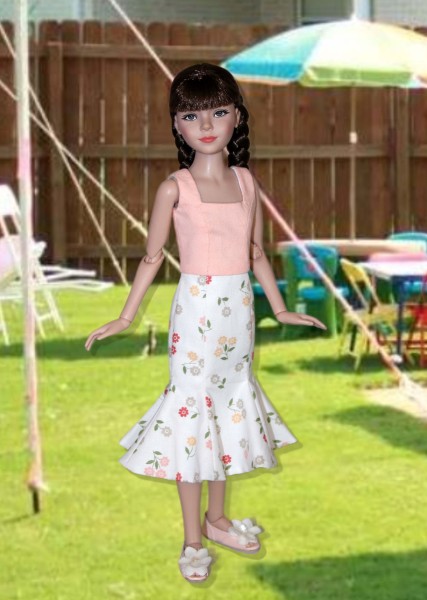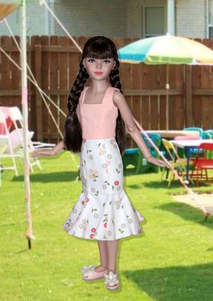 Up for consideration is a sleeveless square neck dress with a six-part flared skirt with snap back closure for 12" Anne dolls. The dress from the Flower Fields pattern.