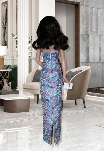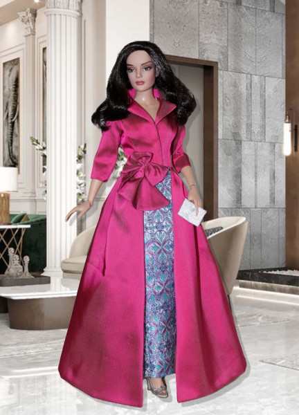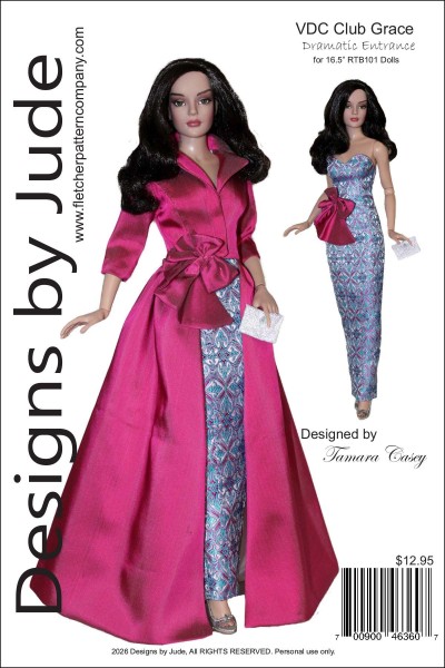 Up for consideration is Dramatic Entrance, a sewing pattern designed to fit 16.5" RTB101 body dolls. The ensemble combines mid-century couture glamour with modern evening wear. It features a strapless, body-skimming evening gown with a zipper back closure and back vent at the hemline paired with a structured overskirt coat. The coat has ¾ length sleeves, a wide stand collar, and a floor-length skirt, forming a dramatic train-like effect with an open front revealing the contrasting skirt underneath. A large sculptural bow at the waist creates the perfect focal point. The pattern was created in sponsorship of the Club Grace subscription program through the Virtual Doll Convention. There is a sewing tutorial for this pattern on the Designs by Jude YouTube channel.